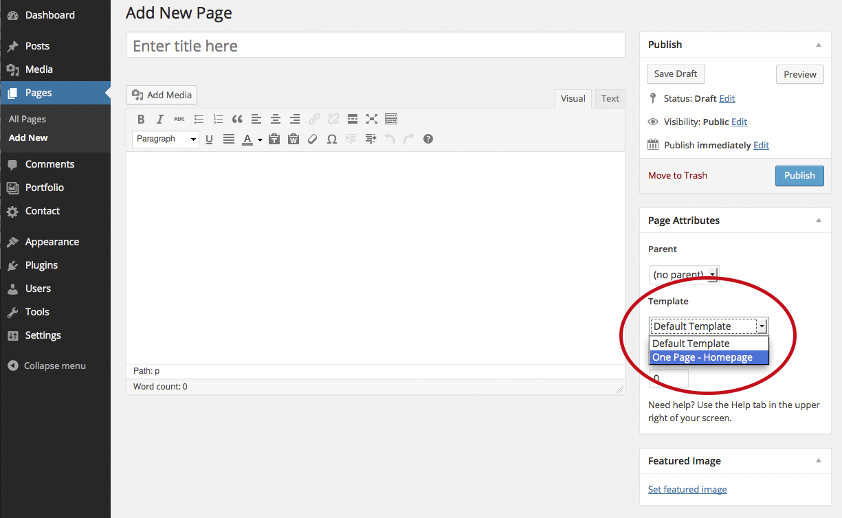 In the Page Attributes section, select One Page - Homepage Templates from the list.